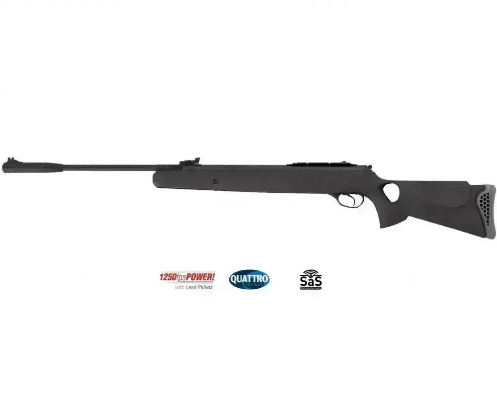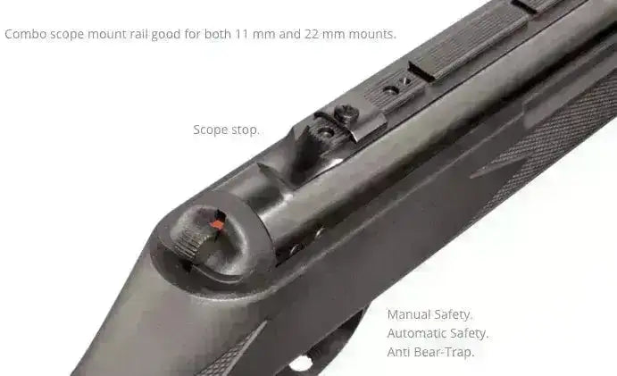 Kolben har tommelhulldesign for et mer rettvinklet og stabilt grep. Rifla er enkel å vedlikeholde og du trenger kun standard 4.5mm pellets for å komme i gang med skytingen.