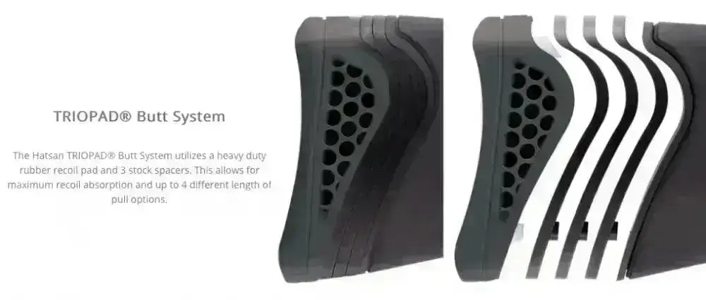 I enden av kolben finner du Hatsans TRIOPAD-system. Dette består av en rekylabsorberende kolbekappe og tre medfølgende mellomlegg som lar deg justere kolbelengden. Systemet reduserer rekyloverføring og gir økt komfort ved skyting med kraftige knekkrifler.