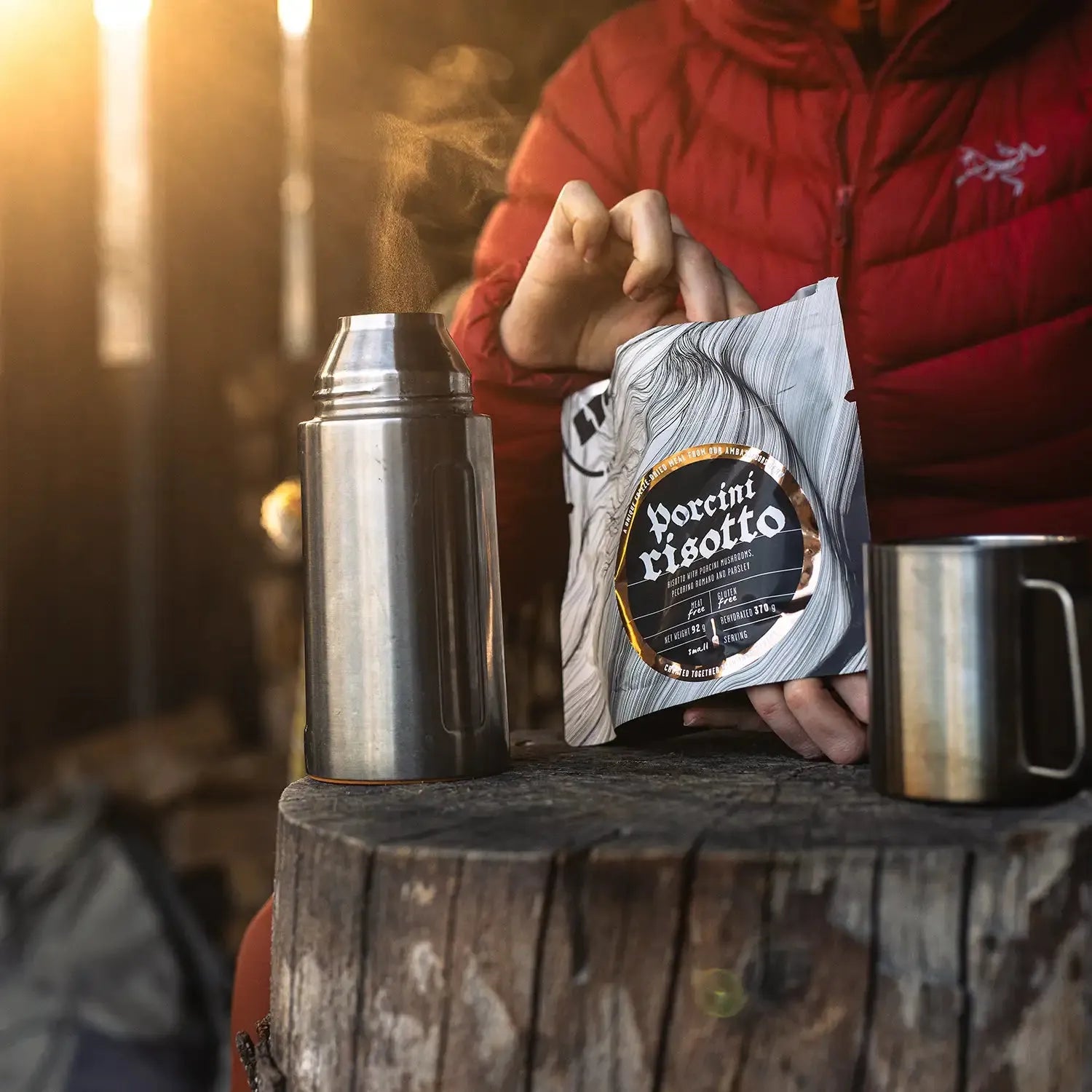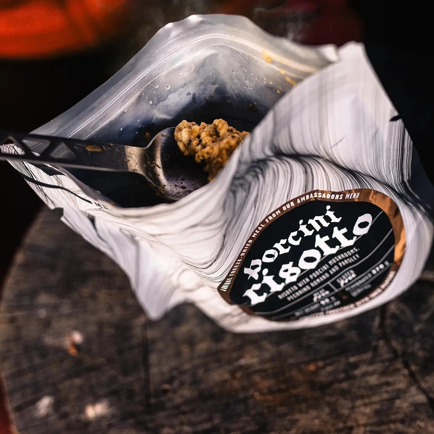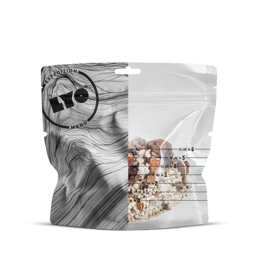 LYOFOOD Porcini Risotto er en kremet turmiddag med ris og steinsopp, også kjent som porcini. Den inneholder smør, fløte, løk og hvitløk, og er smakssatt med urter og en skvett hvitvin for å fremheve den naturlige smaken av sopp. Retten er laget med 100 % naturlige ingredienser – ingen kunstige tilsetningsstoffer – og er perfekt for tur, camping eller som varm middag på kalde kvelder i felt.