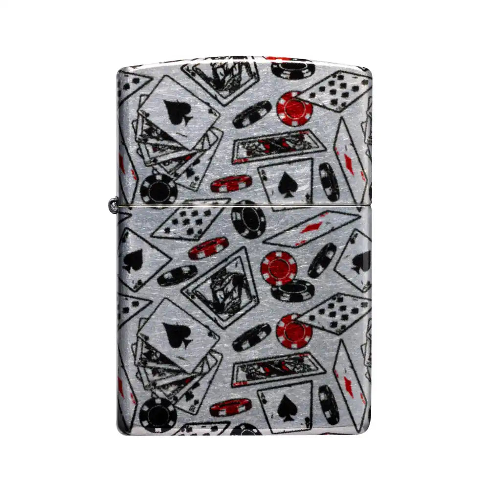En klassisk Zippo for deg som liker kortspill og casino-stemning. Denne Tumbled Chrome-modellen er dekorert med spillkort og pokerchips i et heldekkende 540 Fusion-design som omslutter hele lighteren.