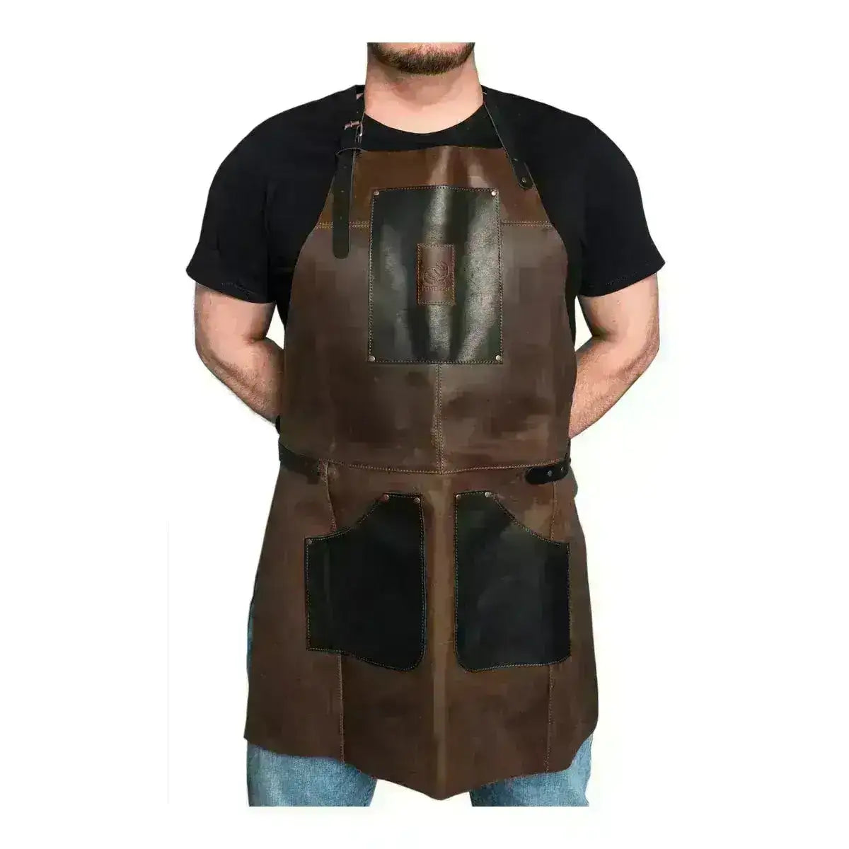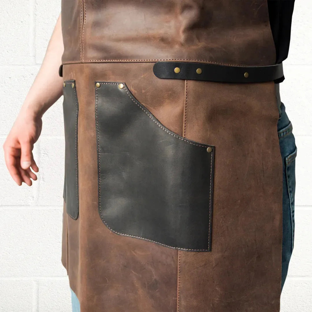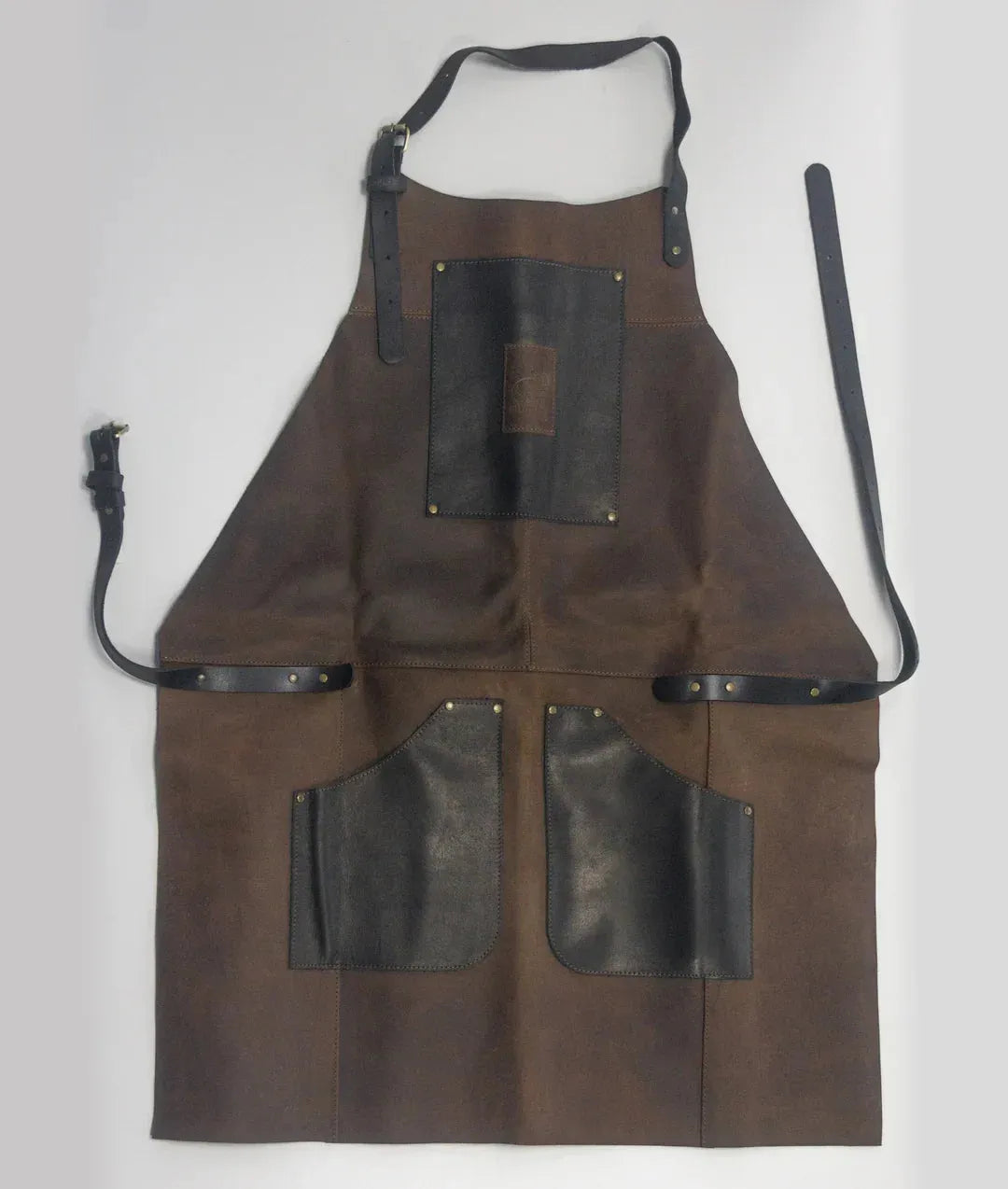 Slitesterkt og stilrent arbeidsforkle i brun og svart lær – for kreative og praktiske yrker