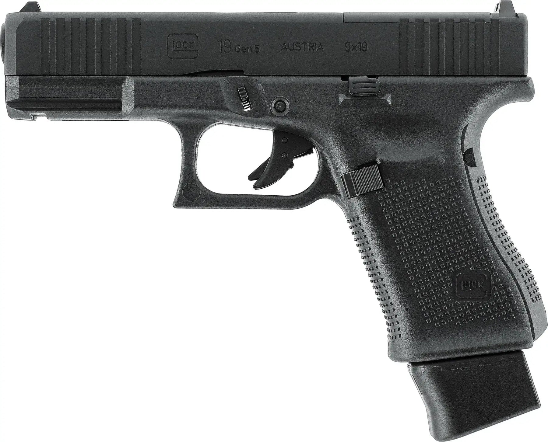 Glock 19 Gen5 MOS er en kompakt CO2-drevet replika med MOS for optikk, justerbar hop-up og Gen5-ergonomi med ambidekstri slide release og vendbar magasinutløser. Magasinkapasitet: 18skudd. Utgangsenergi: <1.0J. Lengde: 175mm. Vekt: 655g.