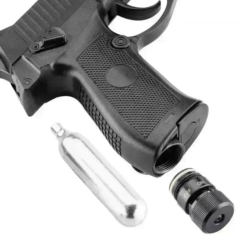 Når Co2 patron er installert og magasinet fylt gir du den et lett slag på skruen til Co2 patronen og pistolen er nå klar til spill eller blinkskyting. Dette gassystemt gjør at du kan klargjøre pistolen på forhånd før bruk - Når du da skal bruke den er det bare et lite dunk på undersiden av grepet som skal til, så er du klar!