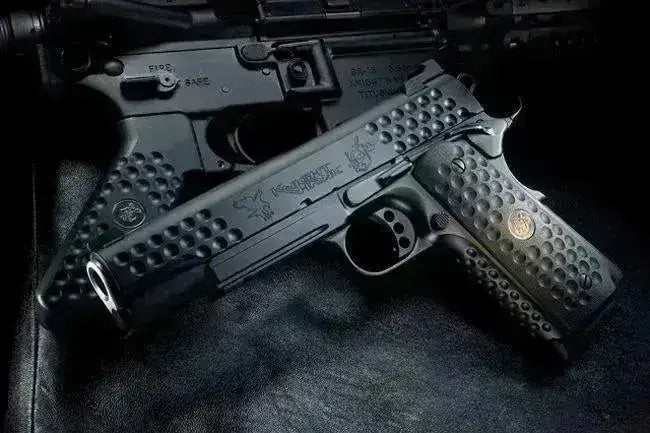 Stilig 1911 softgun replika med blowback. Dette er pistoln for deg som elsker den klassiske Colt pistolen men vil ha et mer taktisk preg på den - Matt svart farge med "golfball" mønster i slide og grep gjør at den skiller seg ut og gir godt grep både rundt slide og pistolgrep.