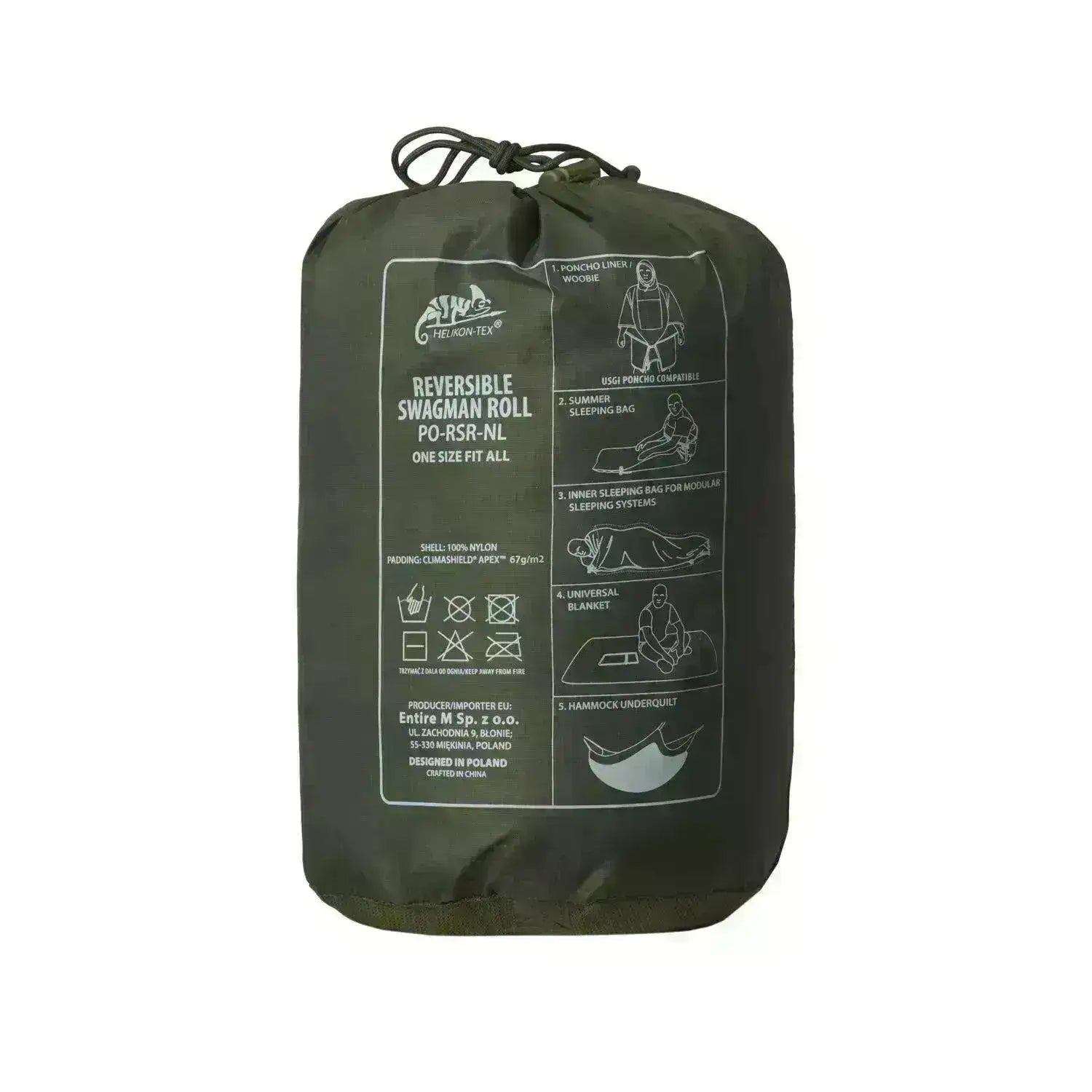 Takket være den avanserte Climashield Apex® isolasjonen med en vekt på 67g/m², er den lett og varm. For å gjøre Reversible Swagman Roll® om til en sovepose, lukker du glidelåsen på kantene. Den kan også kombineres med vår Poncho U.S. Model. Valgfritt kan du feste midjen med spenner slik at materialet sitter nærmere kroppen, som en nødjakke. Reversible Swagman Roll® er perfekt for camping, i bilen, eller som en del av utstyret i en BOB (Bug Out Bag) fluktsekk.