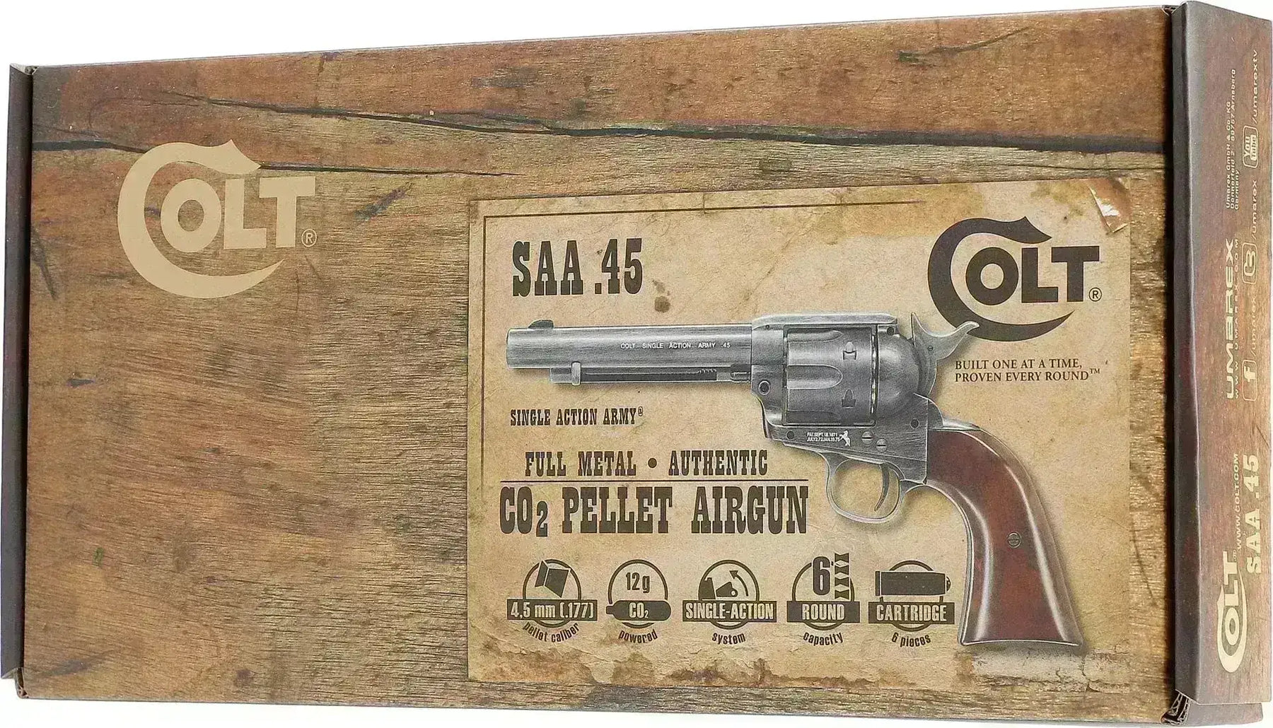 4.5mm Pellets utgaven av denne klassikeren er virkelig en fryd for øyet og revolveren har samme utseende, følelse, og samme funksjonalitet som den orginale .45 Colt Peacemakeren. Som den ekte revolveren går heller ikke tønnen på denne ut. Hver patron lades enkeltvis inn i ladehullet på høyre side av cylinderen. Dra hammeren halvveis bak, deretter roterer du tønnen og setter inn en ny ladet patron. For å fjerne en tom patron gjør du akkuratt det samme motsatt vei og presser på utløserstangen. For å lade patronene med pellets setter du inn en kule i bunnen av magasinet, det gjør at du ikke trenger å ta ut patronene for å lade de med kuler. Pelletsutgaven som du får her kommer med riflet løp for ekstra god presisjon!