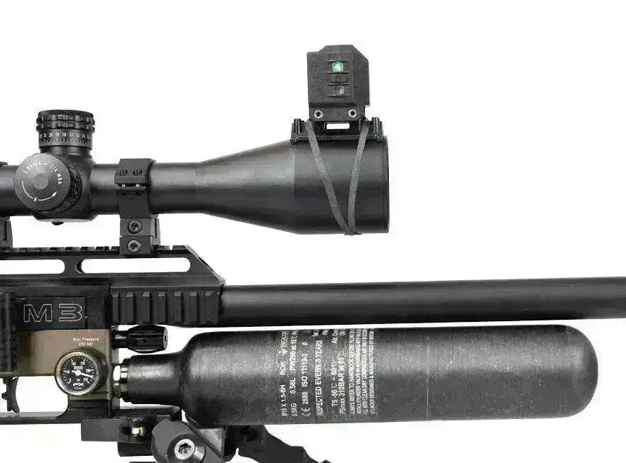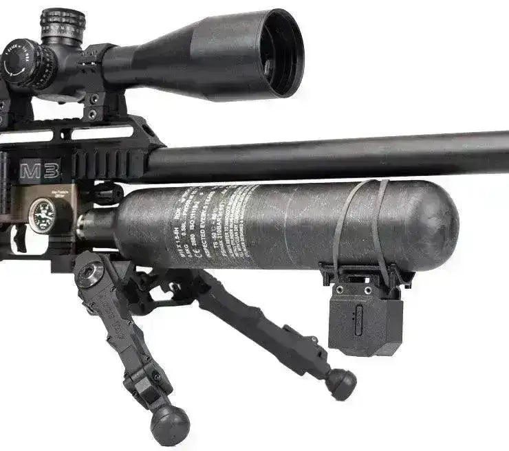 Det medfølger flere forskjellige momtasjer, du kan feste den på en 21mm rail, rundt lufttank og kikkertsikte.