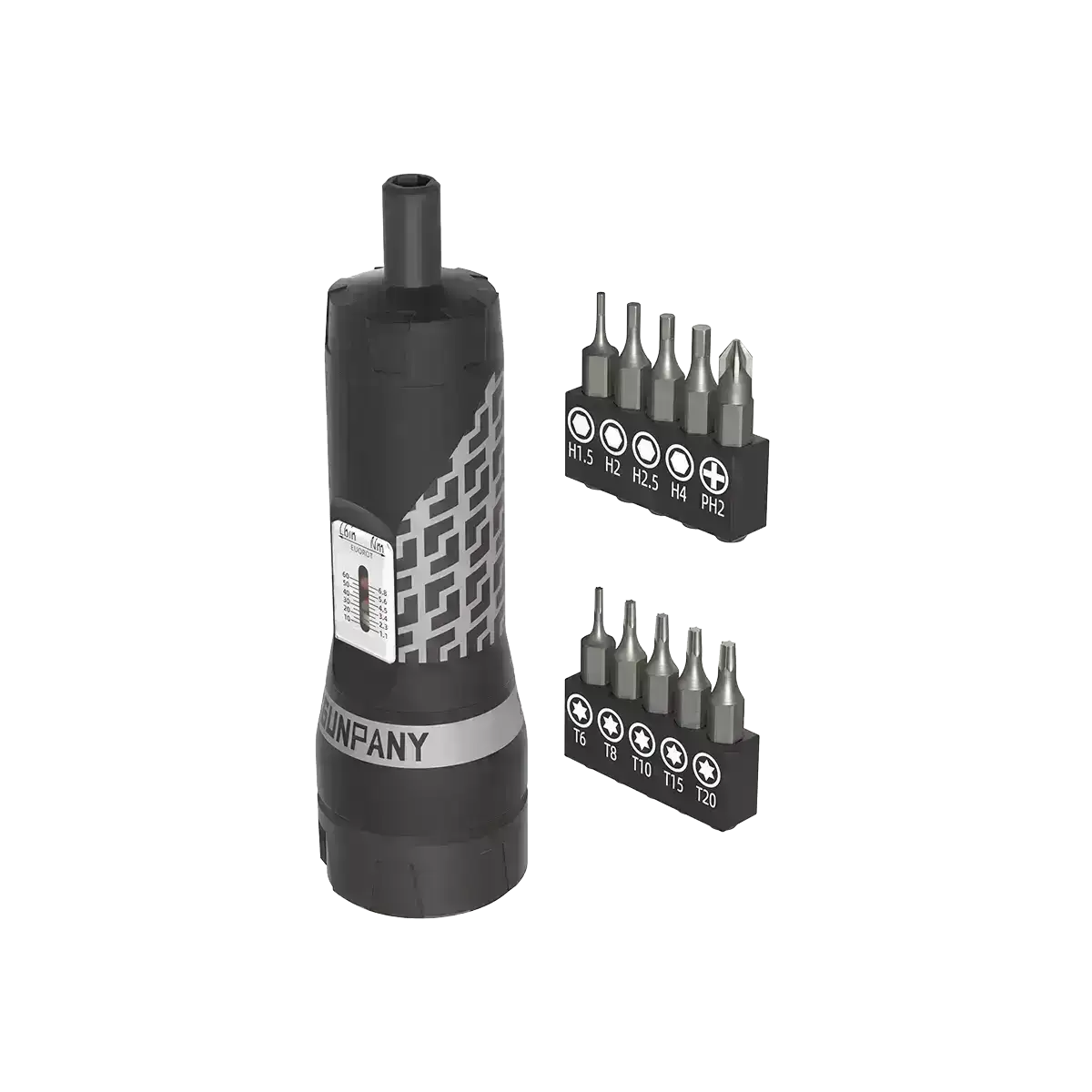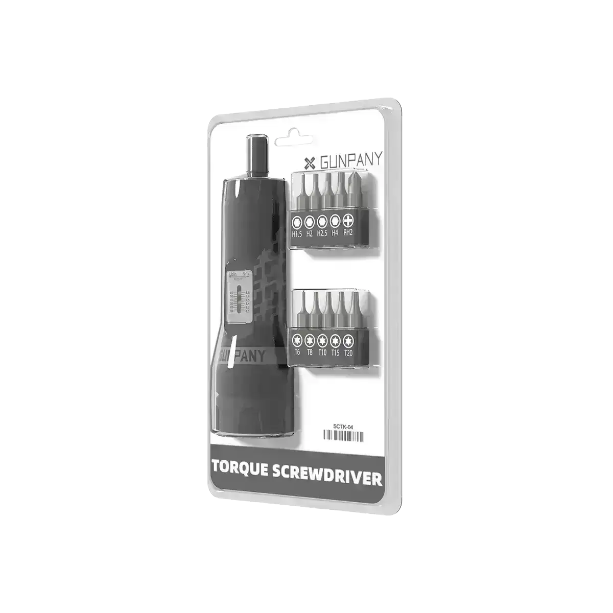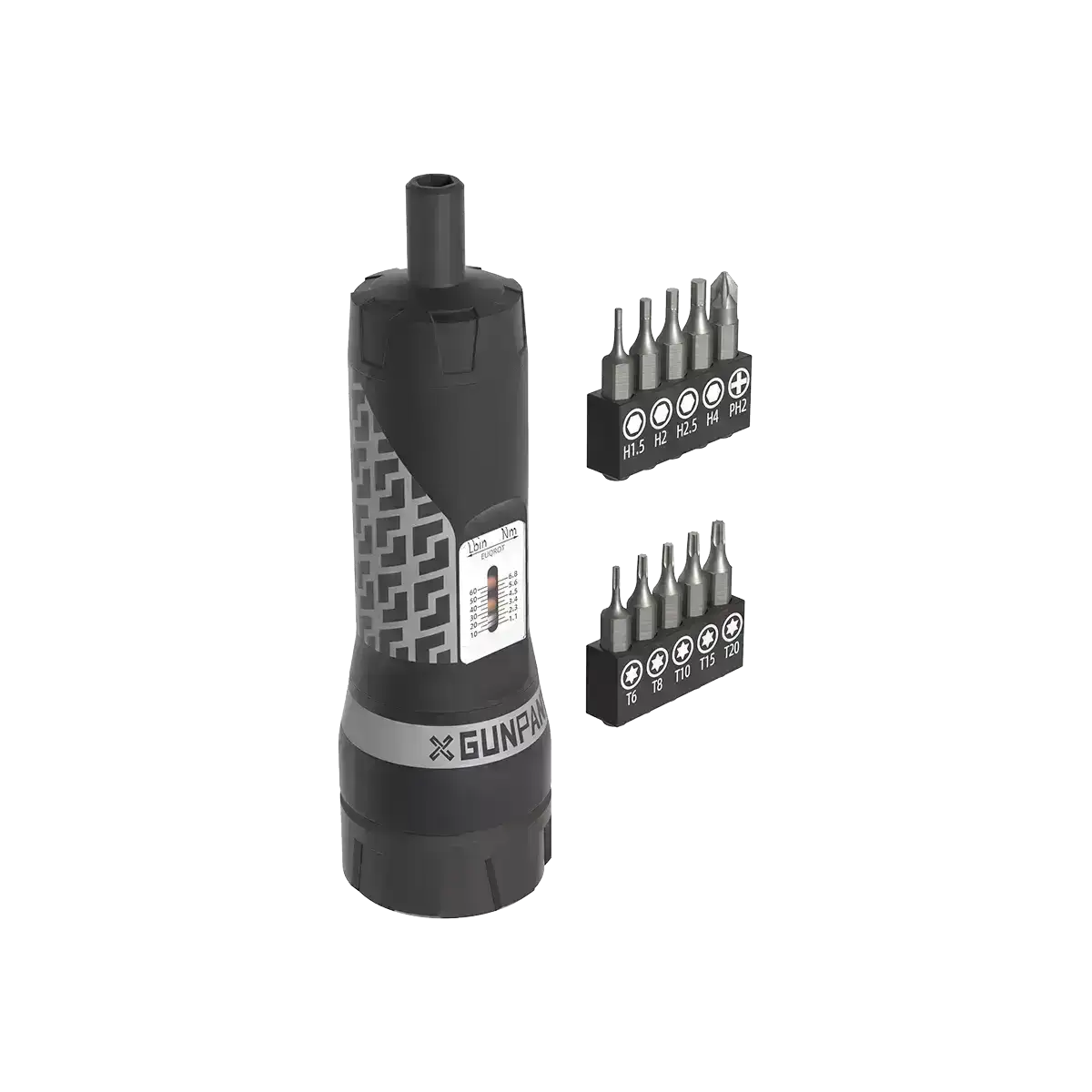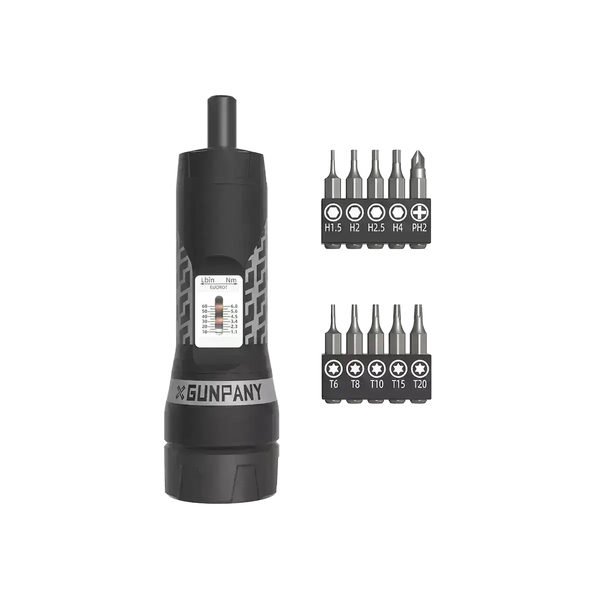 Momentnøkkel skrutrekker fra Gunpany med justerbare innstillinger (10-60 in/lbs & 1,1-6,8 Nm). Perfekt for presis montering av kikkertsikter og annet utstyr. Leveres med 10 ulike bits i stål for ulike behov. Gummiert håndtak for bedre grep og komfort.