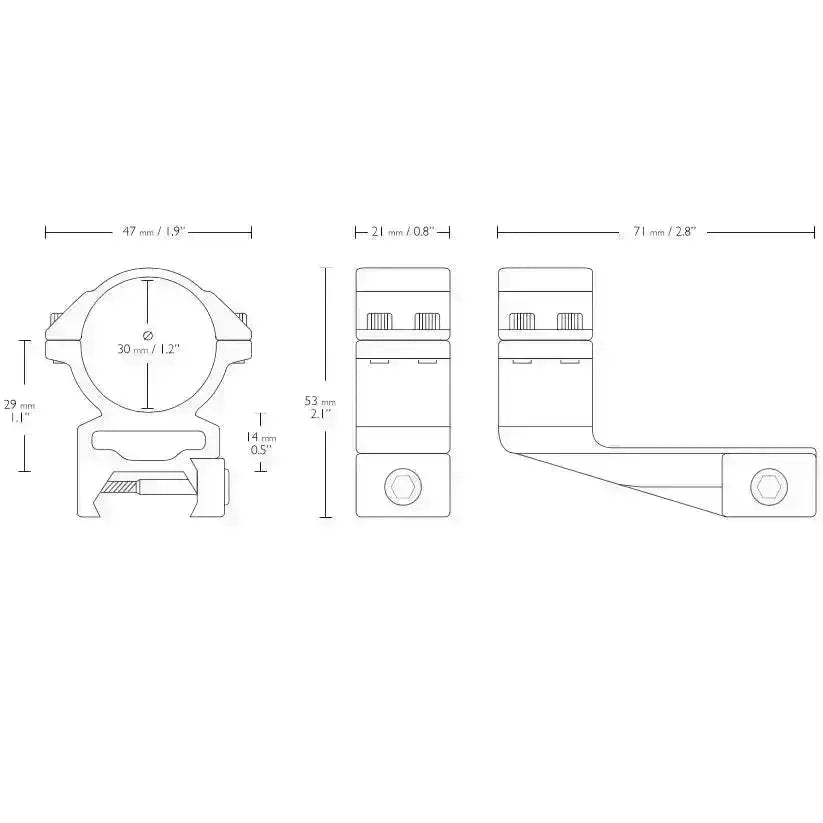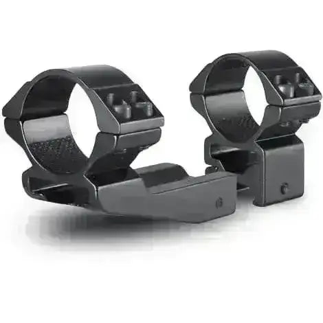 Aluminiums montasjeringer med anodisert svart overflate. Montasjeringene har et mykt og fint belegg på innsiden som holder optikken godt på plass og forhindrer at optikken blir ripet. Montasjeringene er høye for å gi plass til bredere optikk og passer godt til litt større kikkerter.