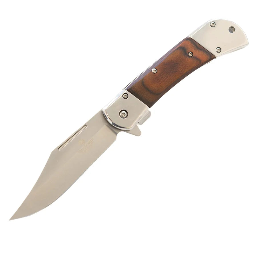 Wild Turkey Cedar Crest er en solid foldekniv i lommeknivformat, laget for deg som vil ha en praktisk og pen kniv til enkle oppgaver i hverdagen og på tur. Den har et varmt trehåndtak med blanke metallbeslag som gir et tidløst uttrykk, og et blad i 3Cr13 stål med fin egg.