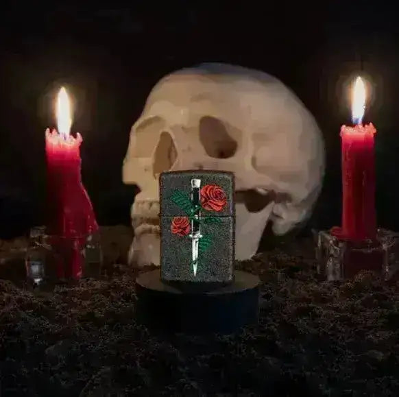 En ekte klassiker med stilettokniv og roser i tatoveringsstil. Black Crackle® finish gir en matt og ruglete overflate, dette er en stilig effekt som også gjør at du ikke ser fingermerker.